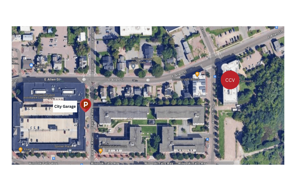 The garage is located one block from the CCV building and provides covered parking that is monitored and secured by the City of Winooski. CCV can provide an escort to the garage for those who request it. Street parking is limited to two hours and is strictly enforced by the City of Winooski. You can park in the public portion of the parking garage (level 1-3) and pay as you go. Please note, if you arrive before 5pm and plan to stay until after 5pm, you cannot pay for parking all at once and will either have to return to the garage to pay for time after 5 pm or pay via the parking app on your phone.