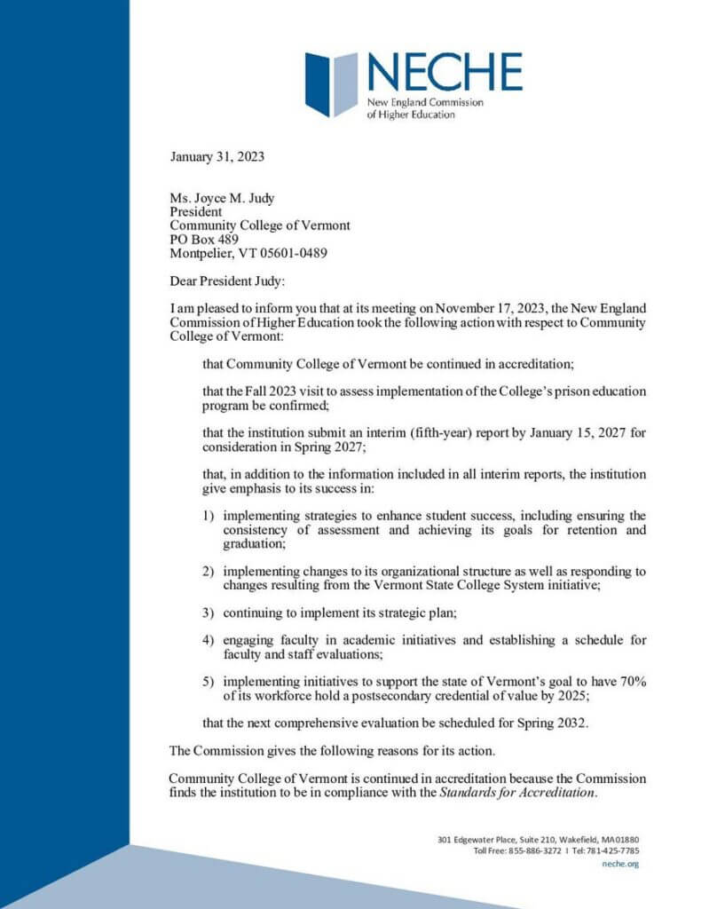 The Community College of Vermont underwent a comprehensive evaluation visit from March 13-16, 2022, by a team representing the New England Commission of Higher Education. The Commission issued its findings in January 2023.