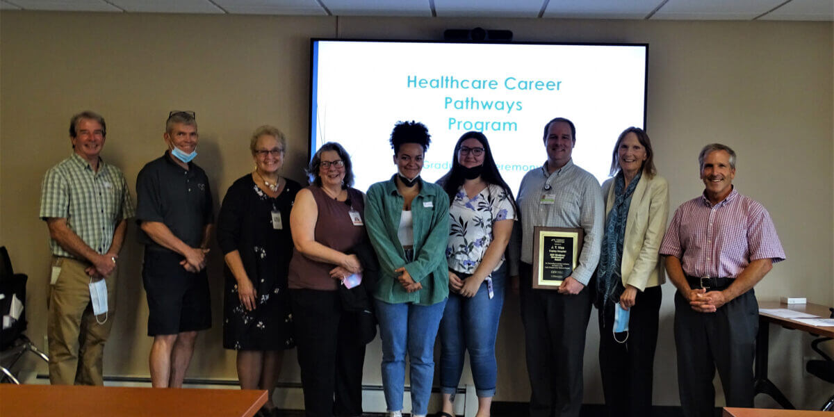 On Tuesday, August 23, 2022, community partners and students gathered at Copley Hospital for the graduation ceremony of the first cohort of the Copley Hospital Healthcare Career Pathways program. Seven students participated in the Copley program, which was developed in partnership with the Community College of Vermont (CCV), HireAbility, and the Vermont Department of Labor.