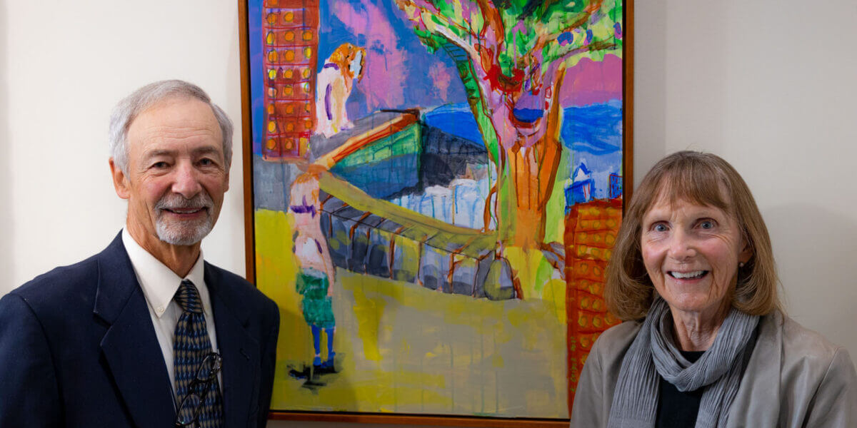At the same time the Geigers spoke with CCV about the scholarship, the College chose to commission a painting from Karen that would forever live at CCV. This painting was hung and unveiled in the Winooski center on October 7. Katie communicated with Karen about what could be included in the painting, but says that ultimately it was left up to Karen. “It couldn’t have been more perfect,” she said of the painting. “It’s so meaningful that what she chose to spend her last active art project on was this painting that has such a deep connection to CCV.” Bill also reflected on how Karen felt about creating the painting: “this was one of the more joyful things that happened to her during her illness. She was excited, and she knew that if the painting was done and went up, that she was going to be present for years to come.”